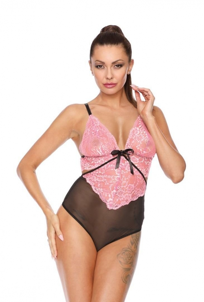 Боди визуально разделено цветом по линии талии. Низ выполнен из черной микросеточки, верх выполнен из невероятной красоты розового кружева!
